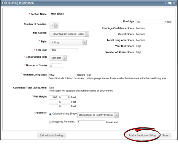 When using Measured Perimeter It is important to account for the perimeter of the home when you are breaking the home into Main Home and Wings to ensure that any shared walls between the main home and the wing are not counted twice Always account for all the walls of the perimeter of the main home and only the additional walls of the wing.