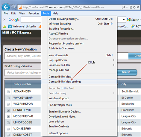 • Make sure your RCT Express site is NOT listed in the “Websites you’ve added to Compatibility View” box. If it is, select it and click Remove.