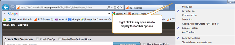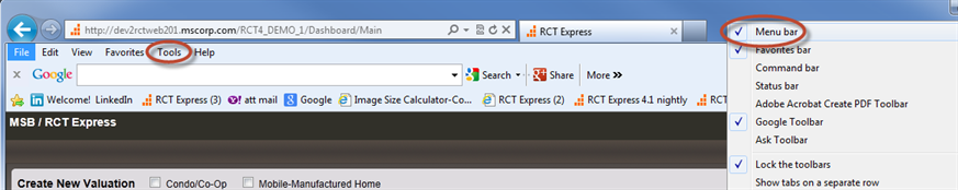 • If the Tools menu is not currently displayed in IE, right click in any open area to display the toolbar options.