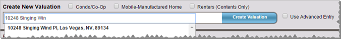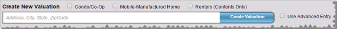 - In the Create New Valuation field enter the address including the ZIP code. If you are creating a valuation for a Condo/Co-op home style or a Mobile-Manufactured home style, or if you want to create a Renters - Contents Only valuation, select the appropriate check box. When you select either style check box and create a valuation, the building information for that particular home style will automatically be applied. If you are creating a valuation for a home style other than Condo/Co-op or Mobile-Manufactured home, then you can select the home style on the Building Information screen.