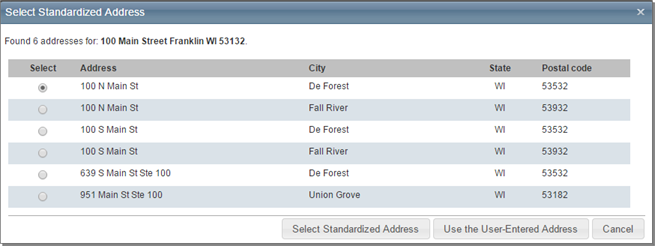 If the address you entered is not recognized as a valid USPS or Canadian postal address the system may prompt you to Select a Standardized Address and may display one or more address options from which you may choose on the Select Standardized Address panel. Under the Select column select the appropriate address and click the Select Standardized Address button, or click the Use the User Entered Address button to proceed with no pre-filled address specific information. It will display the Edit Building Information panel.
