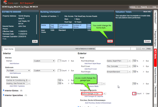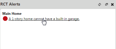 A situation could also exist where the error could be fixed in more than one place. For example, if a 1 story home style is selected and then a built-in garage is added, an error occurs. A 1 story home cannot have a built-in garage. So you could correct the error by either changing the home style or by changing the garage type. RCT Alerts will highlight both areas where the error could be fixed, in this case on the Building Information panel (Edit is highlighted to prompt you to open and edit that info) and on the materials panel where you can edit the garage type.