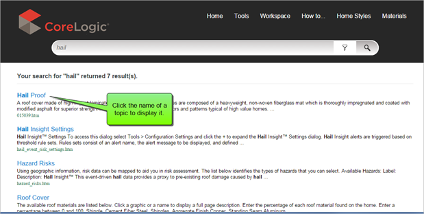 The name of the topics that contain your search word are displayed along with the first few words of the topic. Click the name of the topic to display it.
