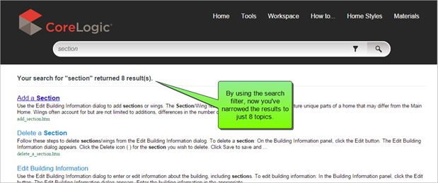 For example, if you wanted to search for the topic on how to add a new section, you may have just entered the word "section" and searched. The system returned 113 results with topics that contain that word! But by using a filter you can narrow your search down to just a few topics.