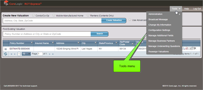 (Note: The tools options shown depend upon user access configuration.)