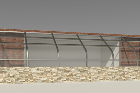 Système mural complet, généralement à la partie supérieure courbe ou inclinée, qui est composé d'un cadre d'aluminium et de verre de sécurité isolé. Convient à des éléments de murs extérieurs tels que de nombreuses ouvertures et formes de coins, fenêtres et portes, typiques des maisons haut de gamme.
