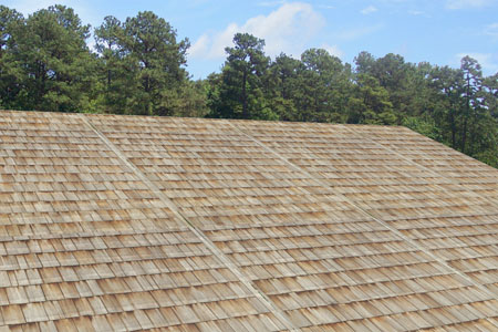 Morceaux de pin de Nouvelle-Angleterre superposés, de forme conique, généralement de dimensions aléatoires. Les bardeaux de pin de la Nouvelle-Angleterre sont installés sur un toit en pente, sur un support de couverture espacé et couvert d'un pare-vapeur. Convient à des matériaux de toit aux couleurs et aux motifs personnalisés, typiques des résidences à valeur élevée.