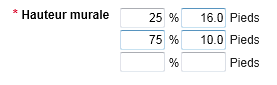 Exemple : Dans une résidence de 2000 pi ca., 500 pi ca. (25 %) correspondent à une grande pièce avec un plafond de 16 pieds (pas un plafond cathédrale), alors que les 1500 pi ca. restants (75 %) ont un plafond de 10 pieds. Dans les champs de hauteur des murs, saisissez 25 % pour la partie à 16 pieds et 75 % pour la partie à 10 pieds.